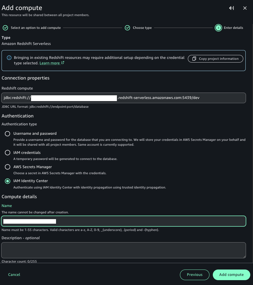 After you set up your project, the next step is to establish a compute resource connection on the SageMaker Unified Studio console. Follow these steps to add either Amazon Redshift Serverless or a provisioned cluster to your project environment: