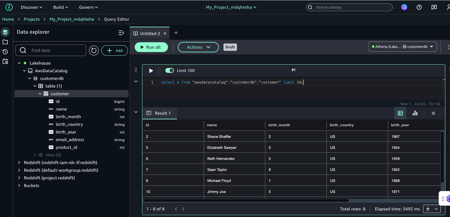 When Ethan logs in to SageMaker Unified Studio using IAM Identity Center authentication, he successfully federates and can access customer data from all countries but only for non-sensitive columns. Let’s connect to Amazon Redshift in SageMaker Unified Studio by following these steps: