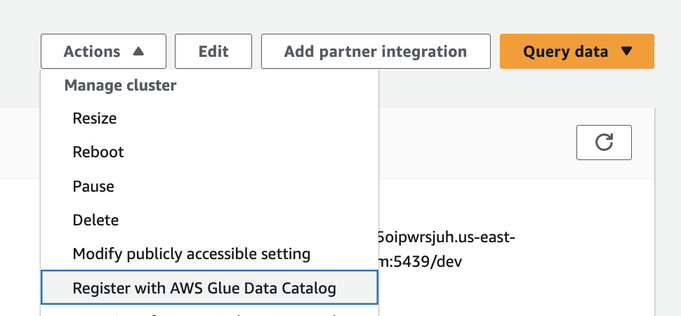 - On the Actions dropdown menu, chose Register with AWS Glue Data Catalog, then choose Register.