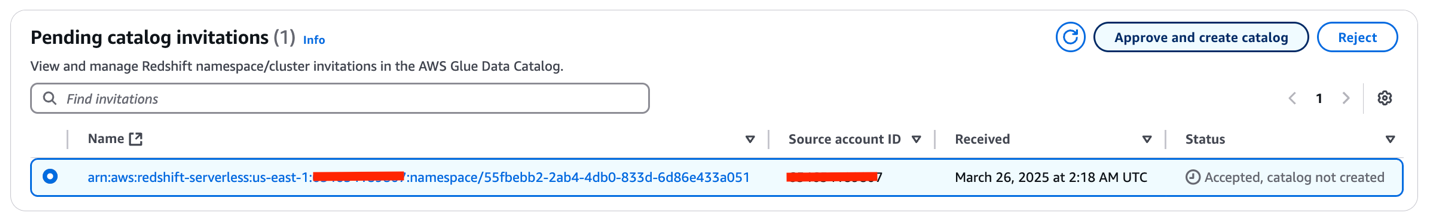 - Under Pending catalog invitations, select the namespace and accept the invitation by choosing Approve and create catalog.