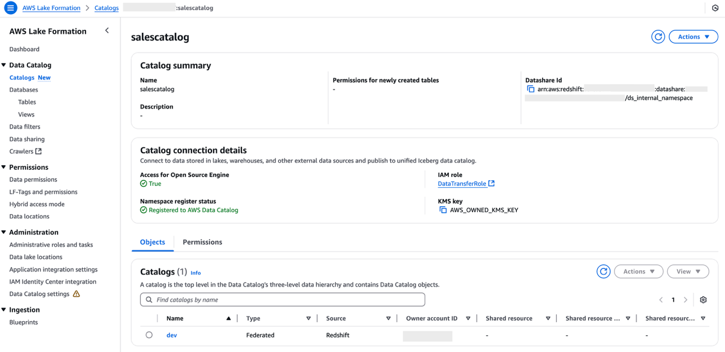 - Sign in to the Lake Formation console as the data lake administrator and choose Catalogs in the navigation pane.