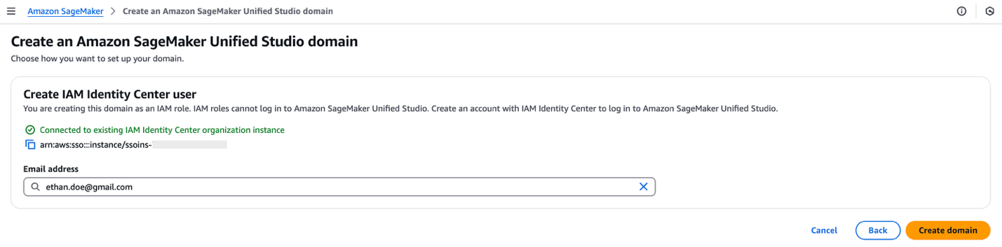 For instructions to create a SageMaker Unified Studio domain, refer to Create an Amazon SageMaker Unified Studio domain – quick setup. Because your IAM Identity Center integration is already complete, you can specify an IAM Identity Center user in the domain configuration settings.