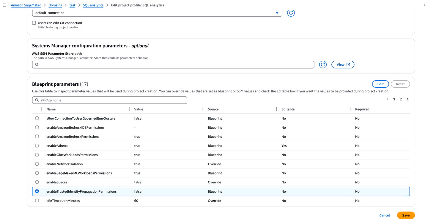 . - To enforce authorization-based on TIP, the SageMaker Unified Studio admin can make this parameter non-editable.
