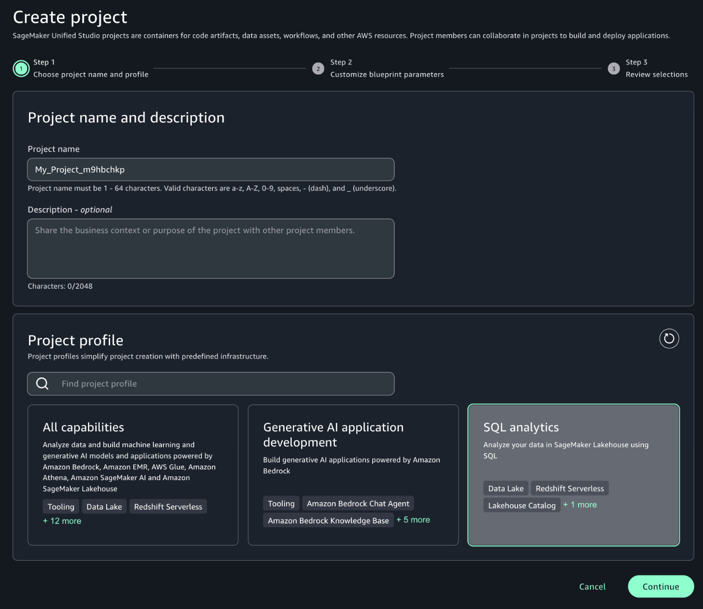 - Choose a project profile. For this demo, we choose the SQL analytics profile from the available templates.