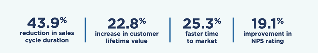 In 2022, AWS commissioned a study conducted by the American Productivity and Quality Center (APQC) to quantify the Business Value of Customer 360. The following figure shows some of the metrics derived from the study. Organizations using C360 achieved 43.9% reduction in sales cycle duration, 22.8% increase in customer lifetime value, 25.3% faster time to market, and 19.1% improvement in net promoter score (NPS) rating.