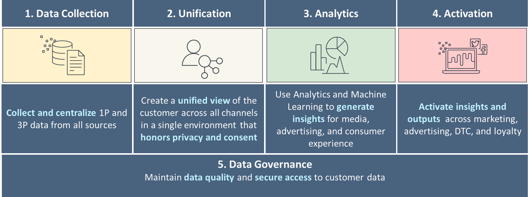 Using the following diagram as a reference, you can create projects and teams for building and operating different capabilities. For example, you can have a data integration team focus on the data collection pillar—you can then align functional roles, like data architects and data engineers. You can build your analytics and data science practices to focus on the analytics and activation pillars, respectively. Then you can create a specialized team for customer identity processing and for building the unified view of the customer. You can establish a data governance team with data stewards from different functions, security admins, and data governance policymakers to design and automate policies.