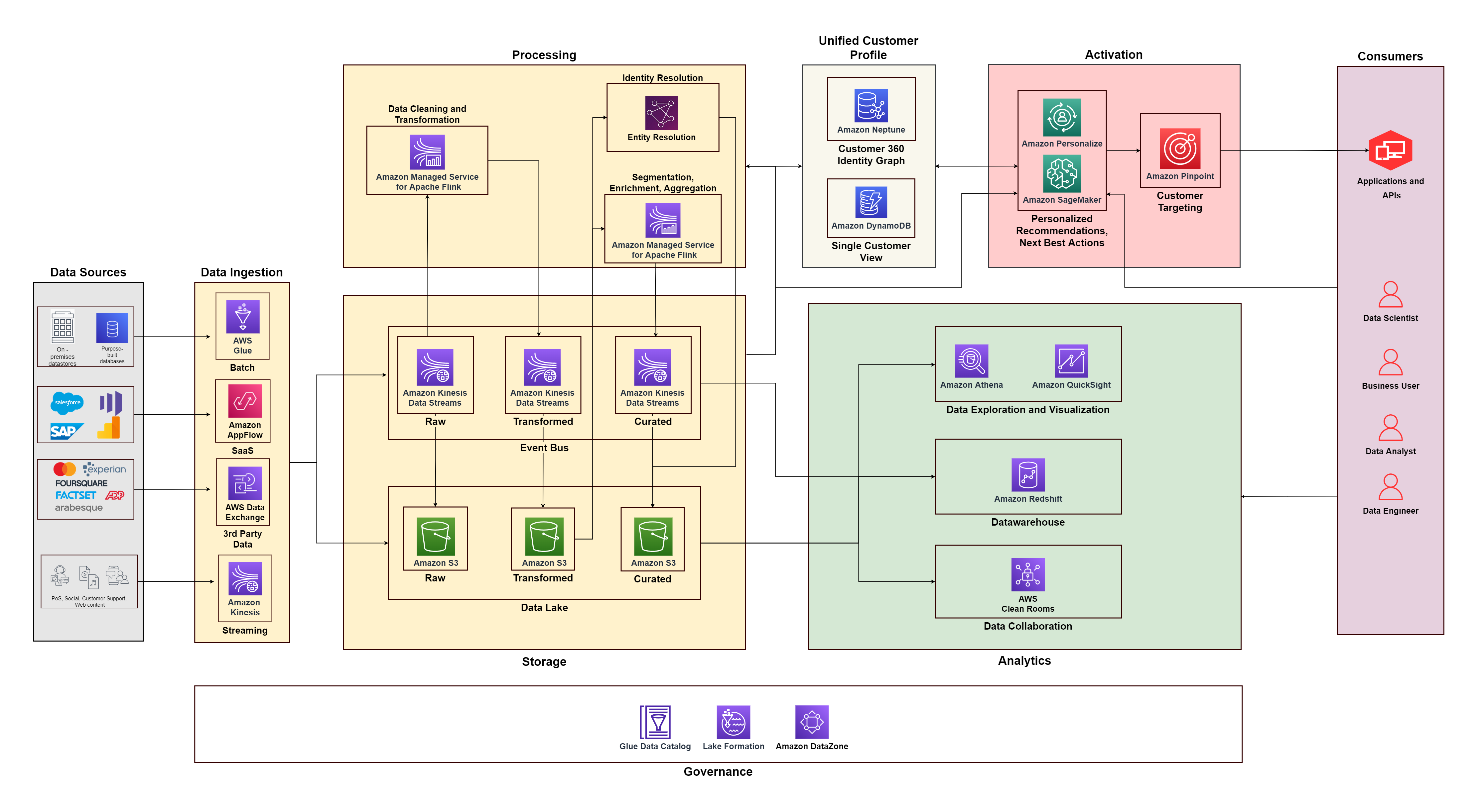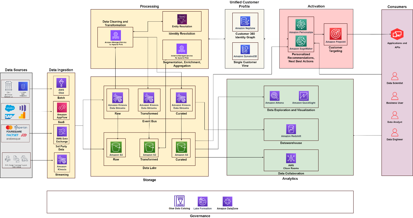 In this post, we discuss how you can use purpose-built AWS services to create an end-to-end data strategy for C360 to unify and govern customer data that address these challenges. We structure it in five pillars that power C360: data collection, unification, analytics, activation, and data governance, along with a solution architecture that you can use for your implementation.
