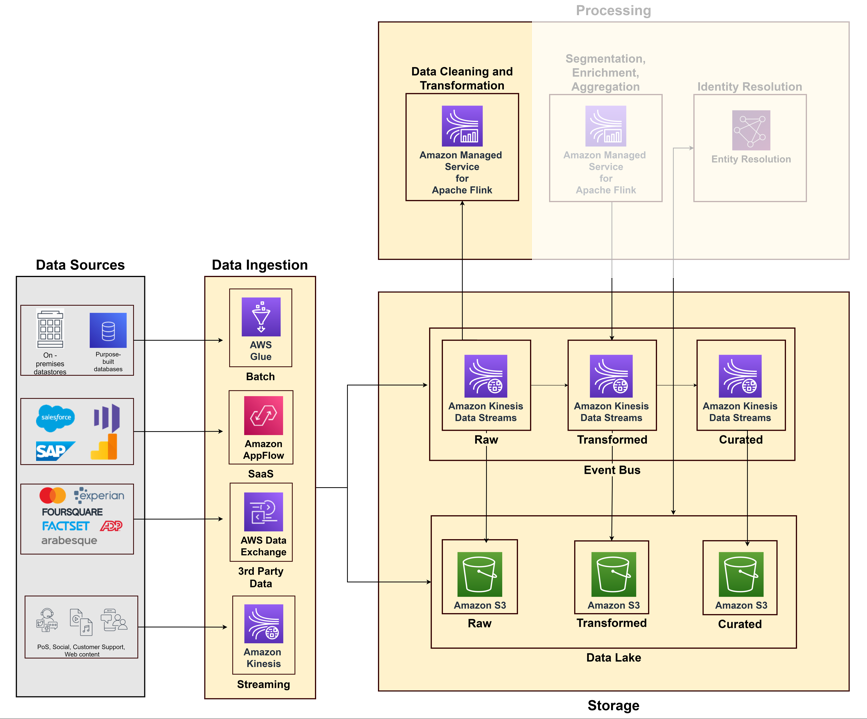 Raw data is often cluttered with duplicates and irregular formats. You need to process this to make it ready for analysis. If you are consuming batch data and streaming data, consider using a framework that can handle both. A pattern such as the Kappa architecture views everything as a stream, simplifying the processing pipelines. Consider using Amazon Managed Service for Apache Flink to handle the processing work. With Managed Service for Apache Flink, you can clean and transform the streaming data and direct it to the appropriate destination based on latency requirements. You can also implement batch data processing using Amazon EMR on open source frameworks such as Apache Spark at 3.5 times better performance than the self-managed version. The architecture decision of using a batch or streaming processing system will depend on various factors; however, if you want to enable real-time analytics on your customer data, we recommend using a Kappa architecture pattern.