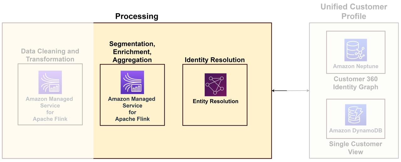To link the diverse data arriving from various touchpoints to a unique customer, you need to build an identity processing solution that identifies anonymous logins, stores useful customer information, links them to external data for better insights, and groups customers in domains of interest. Although the identity processing solution helps build the unified customer profile, we recommend considering this as part of your data processing capabilities. The following diagram illustrates the components of such a solution.