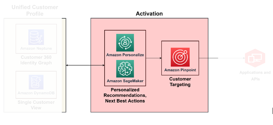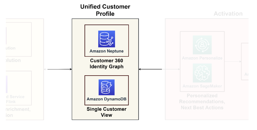 Although graph databases provide in-depth insights, yet they can be complex for regular applications. It is prudent to consolidate this data into a single customer view, serving as a primary reference for downstream applications, ranging from ecommerce platforms to CRM systems. This consolidated view acts as a liaison between the data platform and customer-centric applications. For such purposes, we recommend using Amazon DynamoDB for its adaptability, scalability, and performance, resulting in an up-to-date and efficient customer database. This database will accept a lot of write queries back from the activation systems that learn new information about the customers and feed them back.