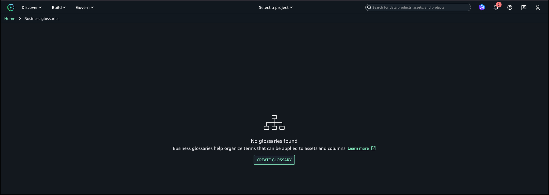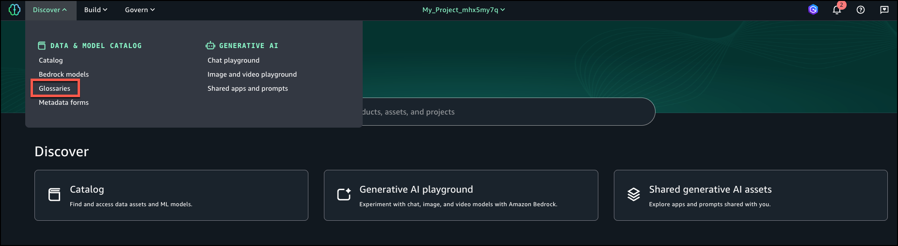 - In SageMaker Unified Studio, on the Discover menu, choose Glossaries.
