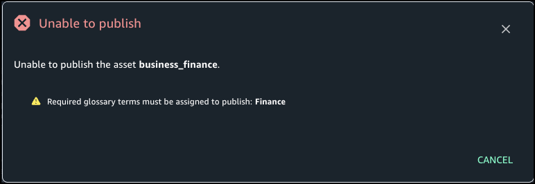 When a producer attempts to publish an asset, SageMaker Catalog checks that the asset includes the required glossary terms or classifications. If any required metadata is missing, the publish action fails with a clear error message. After the metadata is added, the asset can be published successfully.