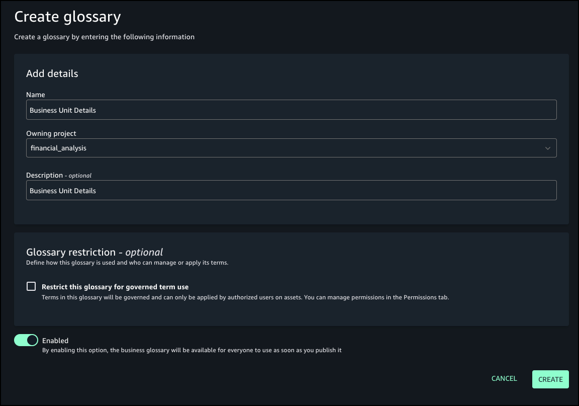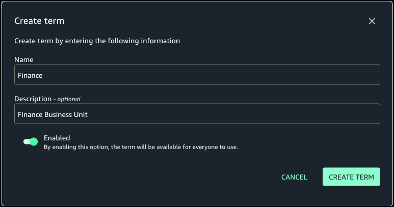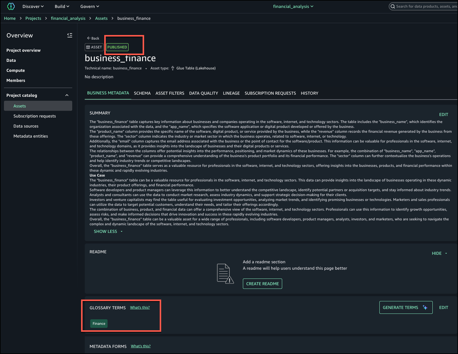financial_analysisproject page, go to your asset. - In the Glossary terms section, choose Add terms.