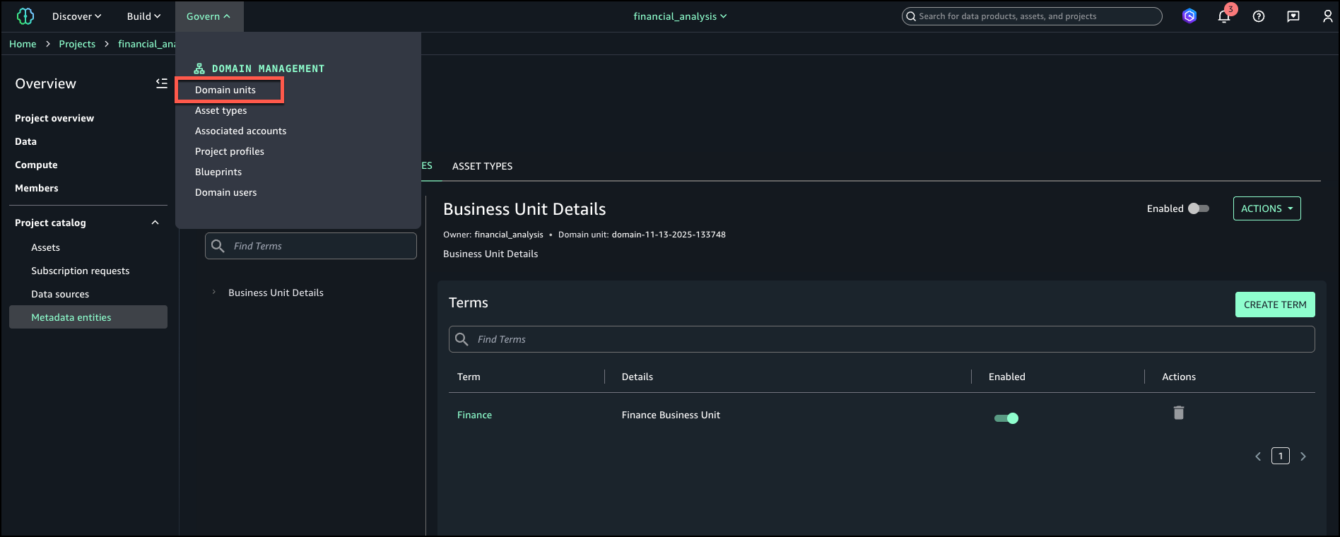 To test this solution, you should have a SageMaker Unified Studio domain set up with a domain owner or domain unit owner privileges. You should also have an existing project to publish assets and catalog assets. For instructions to create these assets, see the Getting started guide.