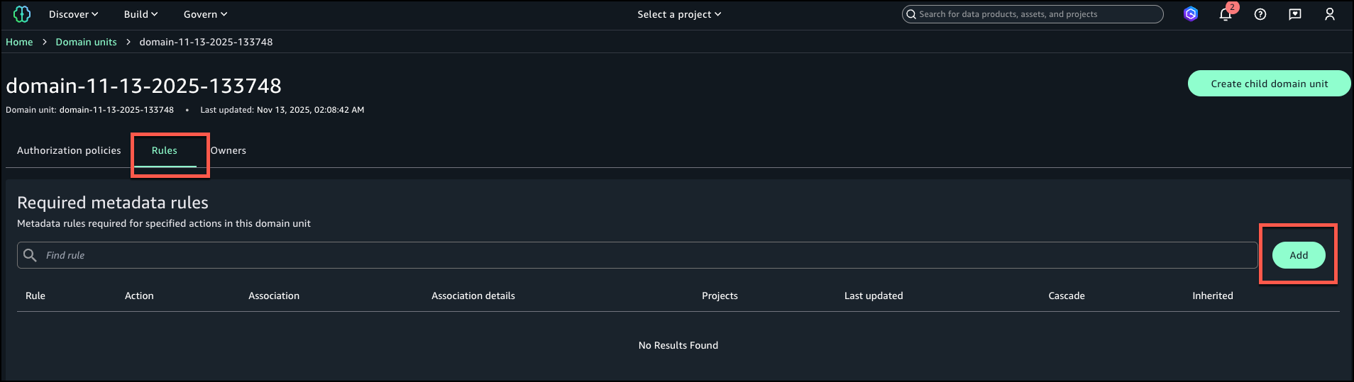 On the Amazon SageMaker Unified Studio console, administrators navigate to Catalog, Governance, Rules and create metadata rules targeting the asset publishing workflow. Rules can specify required glossary terms or classification fields (for example, Business Unit, PII Category, or Data Sensitivity). Rules can apply organization-wide or within specific domains or projects.