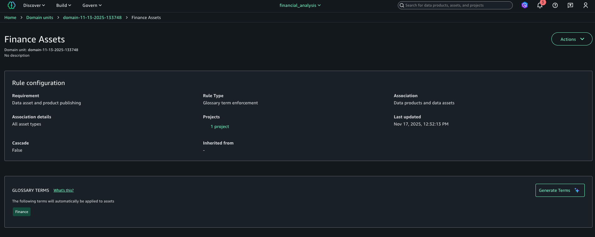 For this post, we explore a financial services use case. Our example a financial services company defines a rule requiring all datasets published from the project to have ‘Finance’ glossary associated: