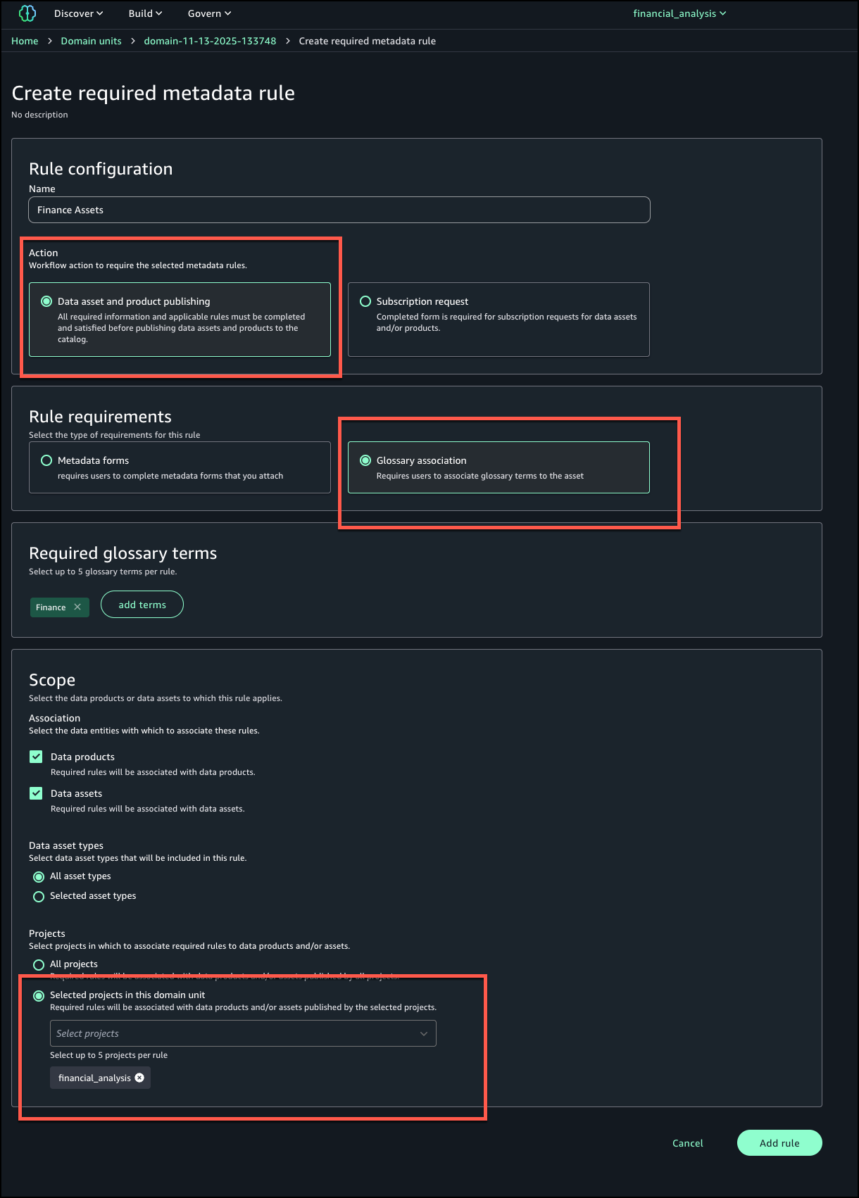 Financeproject to have theFinancetag for all assets published to the catalog. - Choose Add rule.