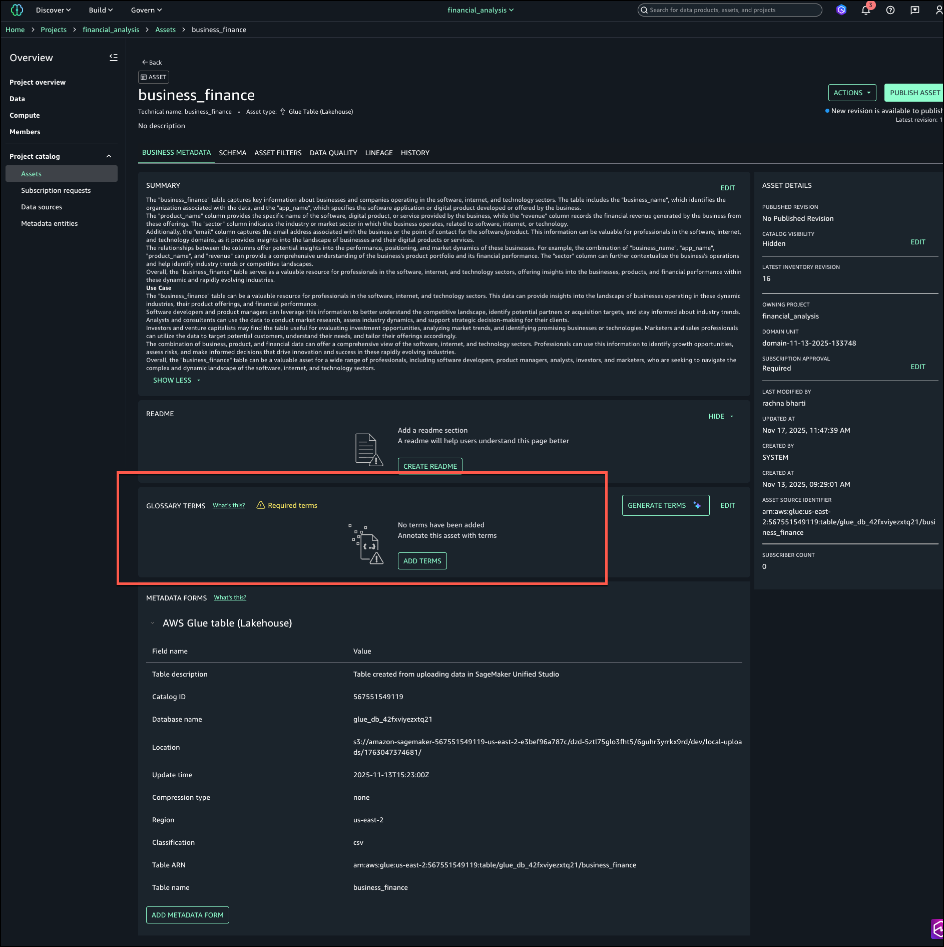 financial_analysisproject page, go to your asset. - In the Glossary terms section, choose Add terms.