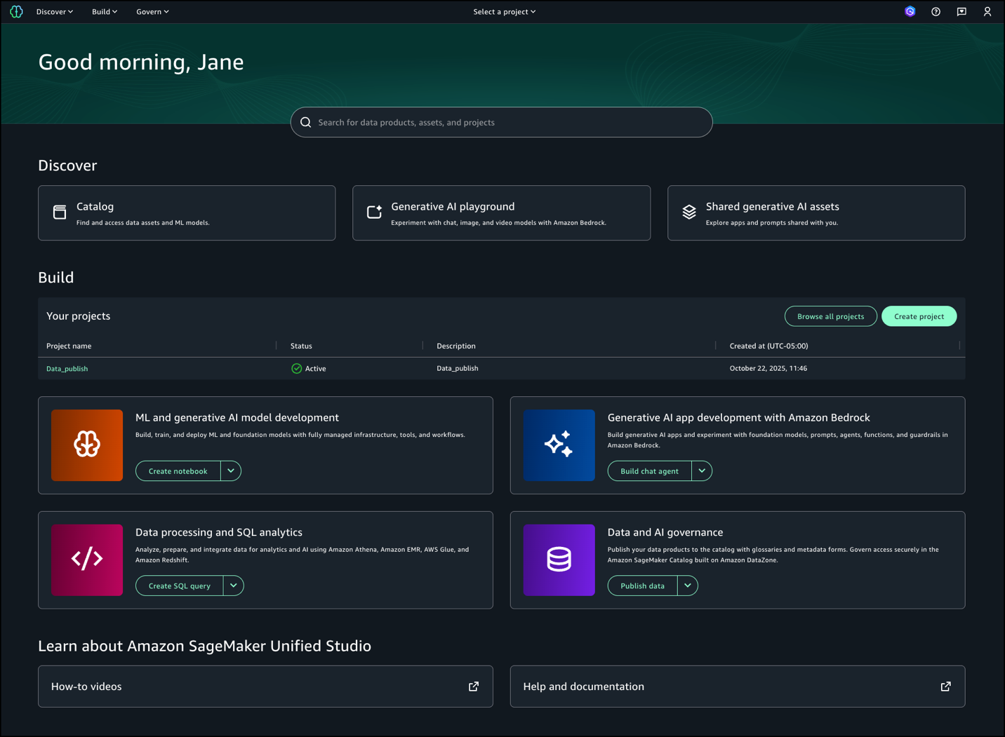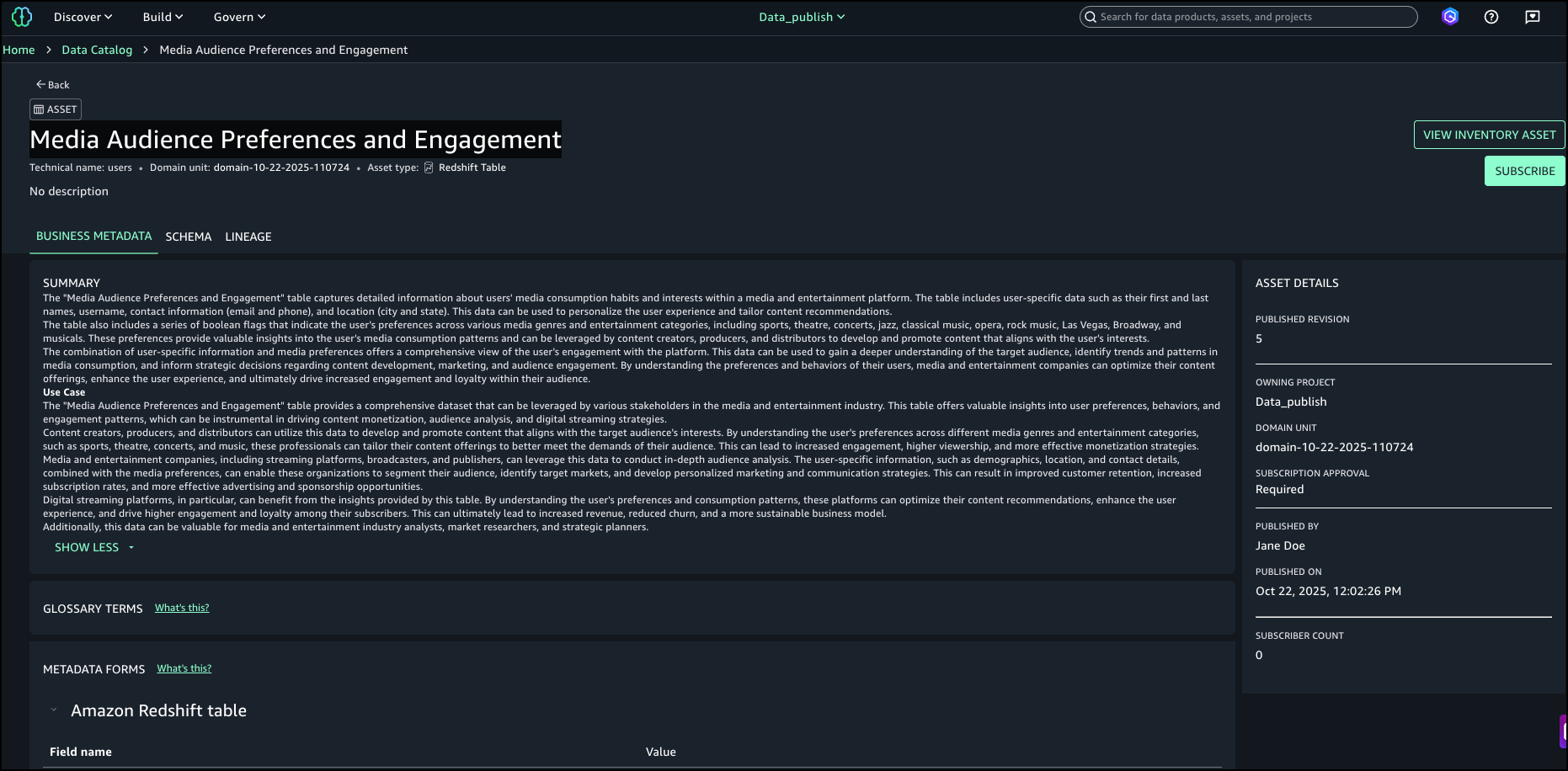 To test this solution you should have an Amazon SageMaker Unified Studio domain set up with a domain owner or domain unit owner privileges. You should also have an existing project to publish assets and catalog assets. For instructions to create these assets, see the Getting started guide.