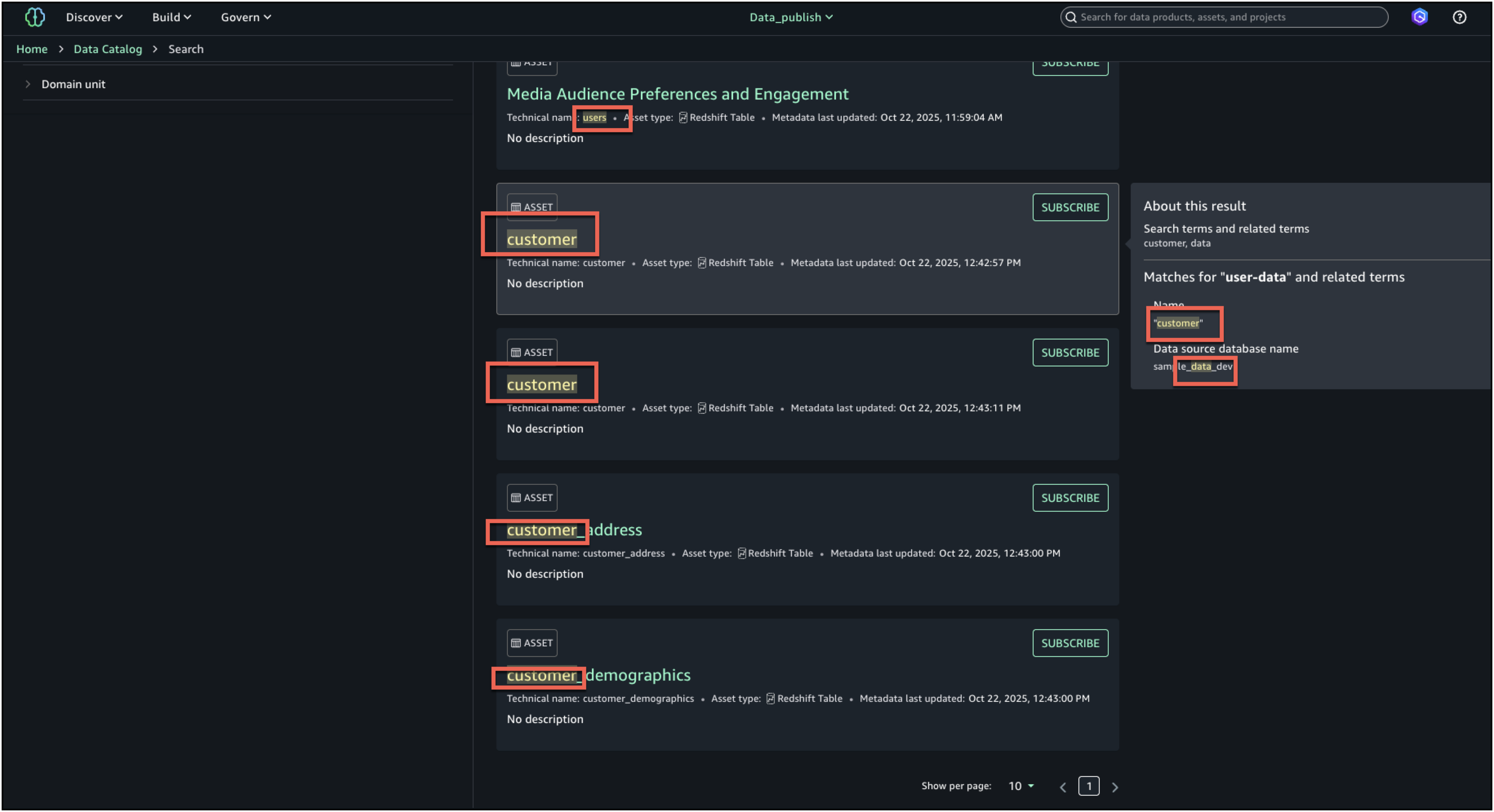 Enhanced search transparency in Amazon SageMaker Unified Studio transforms data discovery by providing clear visibility into why assets appear in search results. The inline highlighting and detailed match explanations help users quickly identify relevant datasets while building trust in the data catalog. By showing exactly which metadata fields matched their queries, users spend less time evaluating irrelevant assets and more time analyzing the right data for their projects.