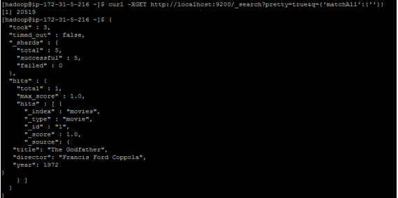 $ curl -XGET http://localhost:9200/_search?pretty=true&q={'matchAll':{''}}
