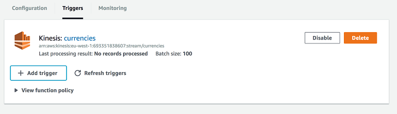 Setting up a Kinesis stream can be done with a few clicks, and the same for Kinesis Firehose. Firehose can be configured to automatically consume data from a Kinesis Data Stream, and then write compressed data every N minutes to Amazon S3. When I want to process a Kinesis data stream, it’s very easy to set up a Lambda function to be executed on each message received. I can just set a trigger from the AWS Lambda Management Console, as shown following.