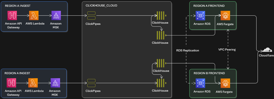 The need to cater to multiple data storage regions also brought challenges—with latency, complexity, and cost the foremost concerns. However, the AWS, ClickHouse Cloud, and Cloudflare stack made available a powerful set of networking tools and scaling options. While VPC peering, RDS replication, and global server load balancing did the heavy lifting on the networking side, the ability to scale and right-size each resource kept costs to a minimum.