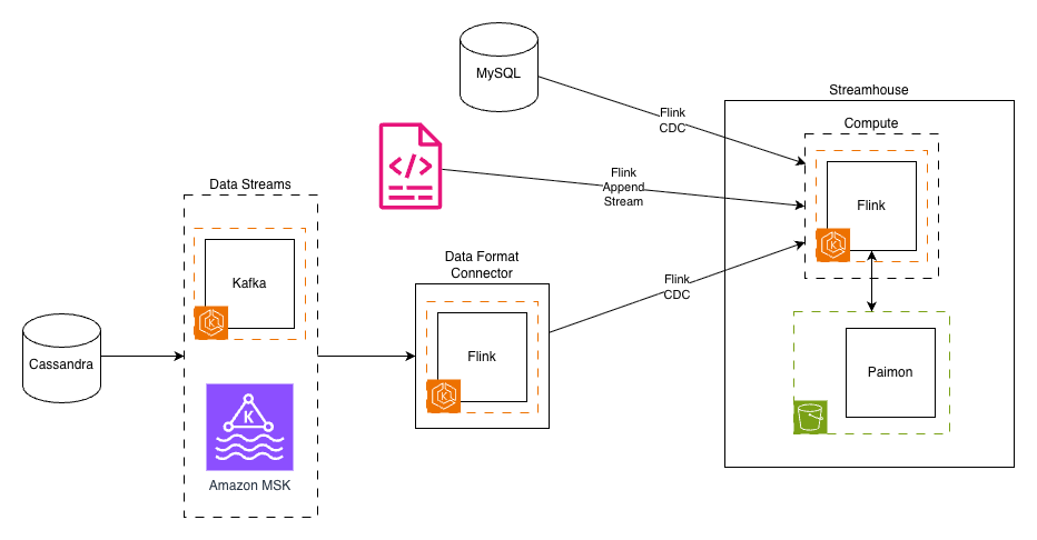 - Paimon ingestor: A Flink job that could ingest data from Kafka sources into Paimon tables, handling schema evolution automatically.