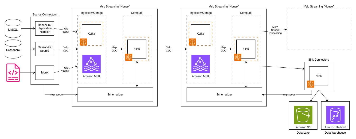 Yelp processes massive amounts of user data daily—over 300 million business reviews, 100,000 photo uploads, and countless check-ins. Maintaining sub-minute data freshness with this volume presented a significant challenge for our Data Processing team. Our homegrown data pipeline, built in 2015 using then-modern streaming technologies, scaled effectively for many years. As our business and data needs evolved, we began to encounter new challenges in managing observability and governance across an increasingly complex data ecosystem, prompting the need for a more modern approach. This affected our outage incidents, making it harder to both assess impact and restore service. At the same time, our streaming framework struggled with Kafka for data streaming and permanent data storage. In addition, our connectors to analytical data stores experienced latencies exceeding 18 hours.