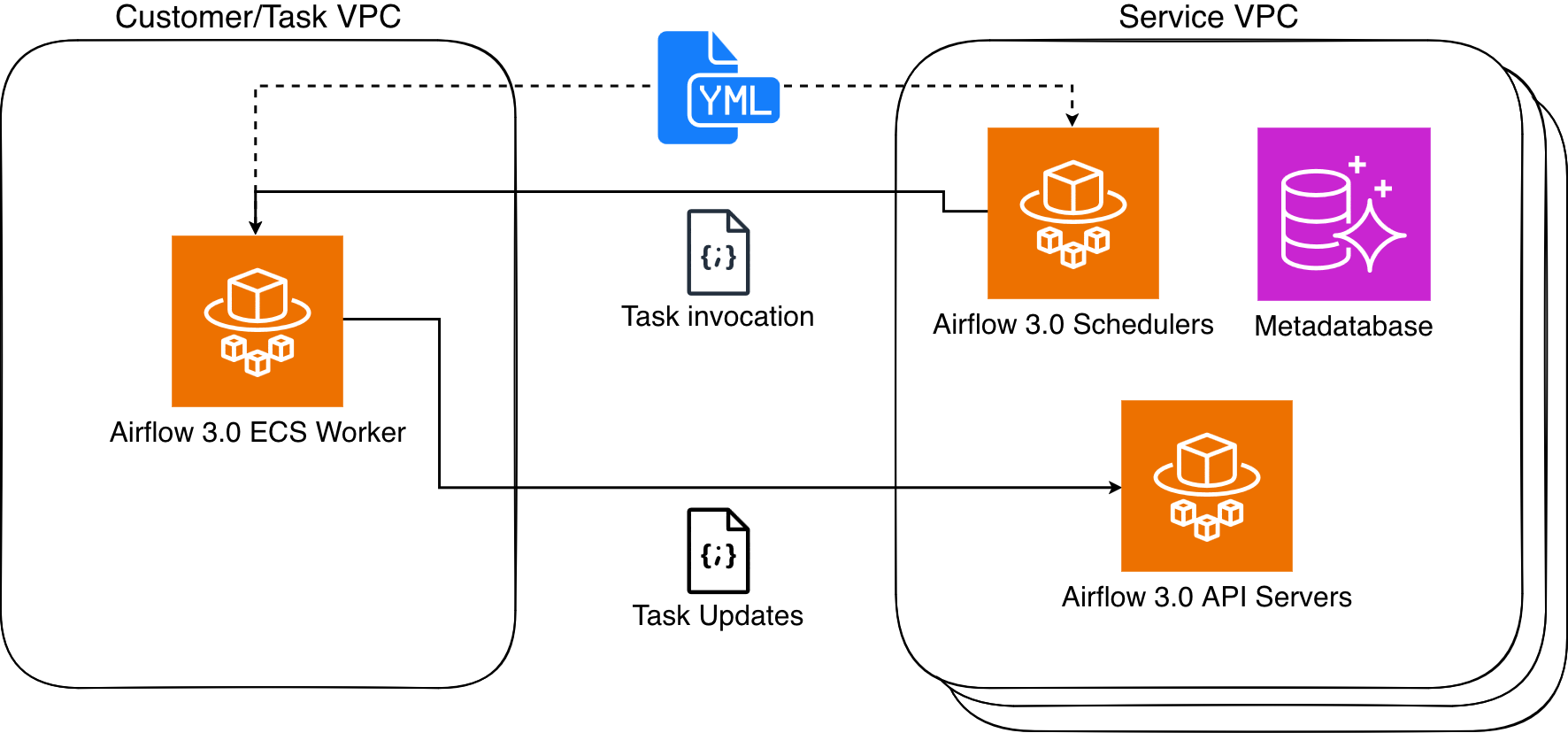 MWAA Serverless processes your workflow definitions and executes them efficiently in service-managed Airflow environments, automatically scaling resources based on workflow demands. MWAA Serverless uses the Amazon Elastic Container Service (Amazon ECS) executor to run each individual task on its own ECS Fargate container, on either your VPC or a service-managed VPC. Those containers then communicate back to their assigned Airflow cluster using the Airflow 3 Task API.