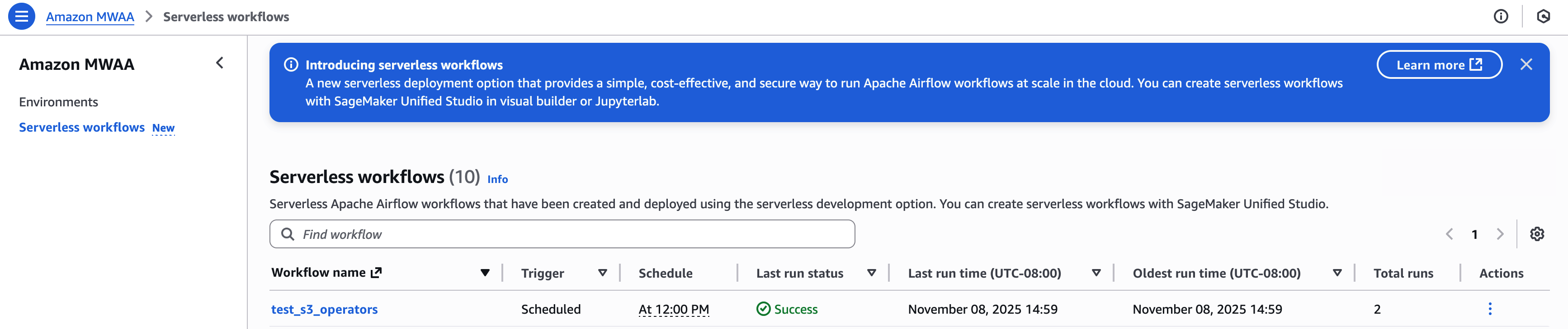 You may view and manage your workflows in the Amazon MWAA Serverless console:
