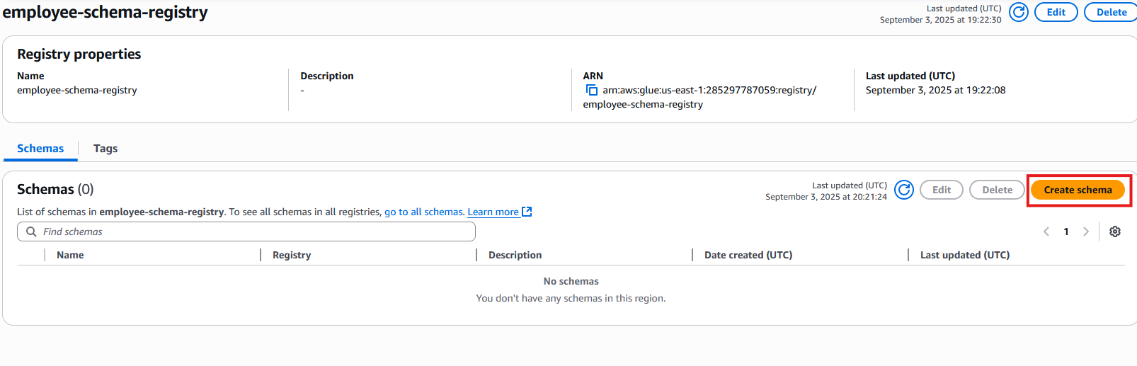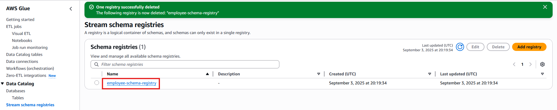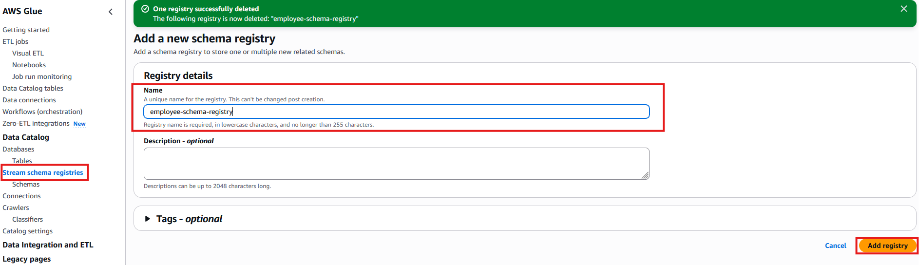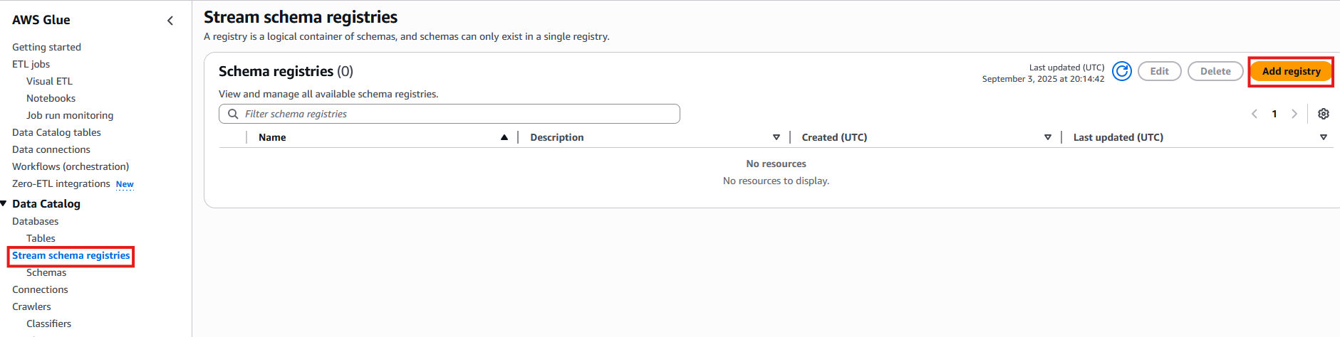 - On the AWS Glue console, choose Stream Schema registries in the navigation pane.