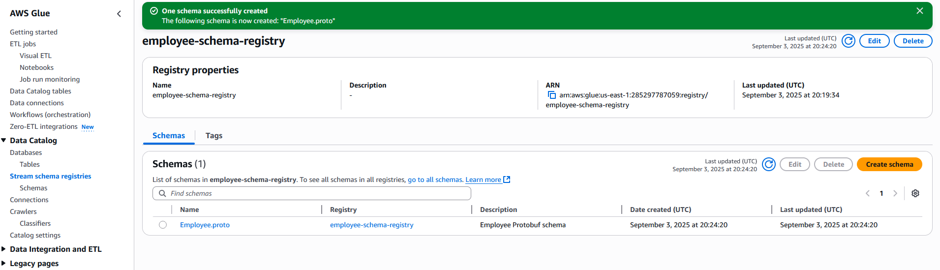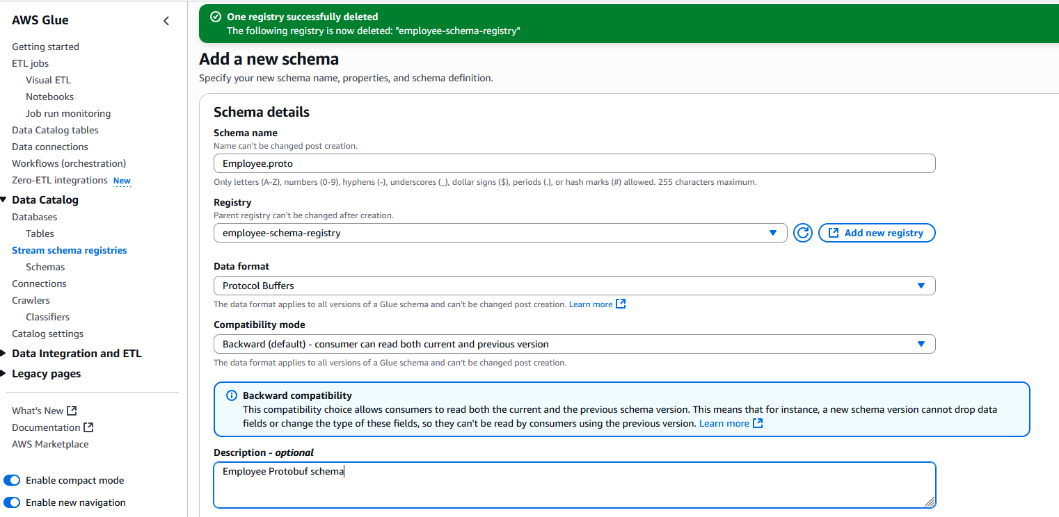In this section, we create a protobuf schema in AWS Glue Schema Registry via the console and AWS CLI.