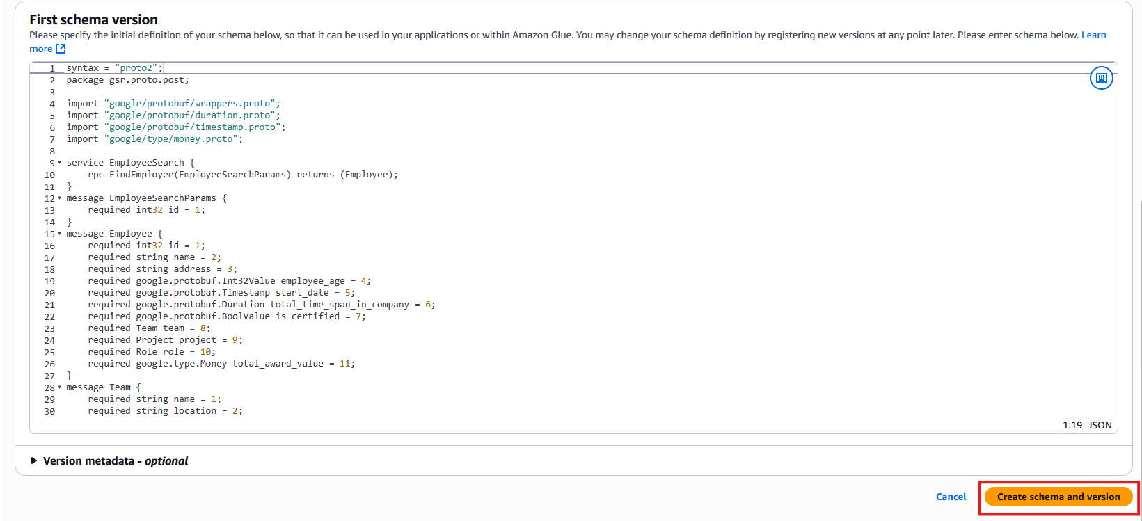 - For First schema version, enter the preceding protobuf schema, then click Create schema and version.