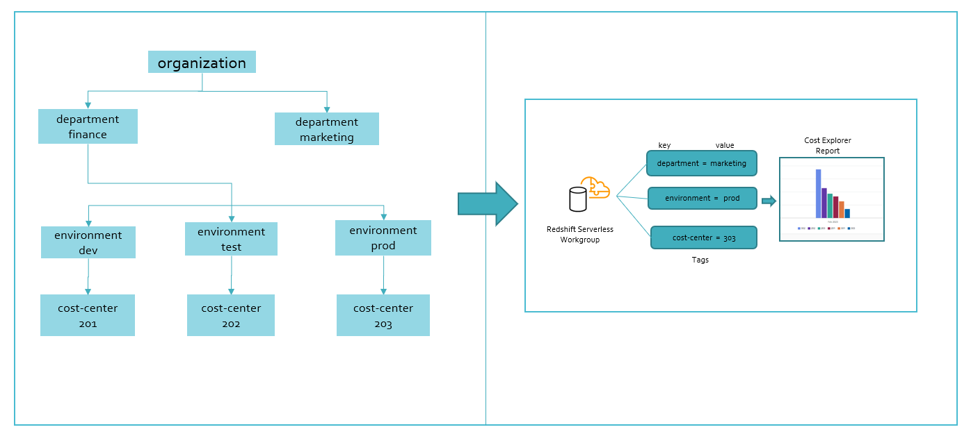 Let’s say that your company has two departments: marketing and finance. Each department has multiple cost centers and environments, as illustrated in the following figure. In AWS Cost Explorer, you want to create cost reports for Redshift Serverless by department, environment, and cost center.
