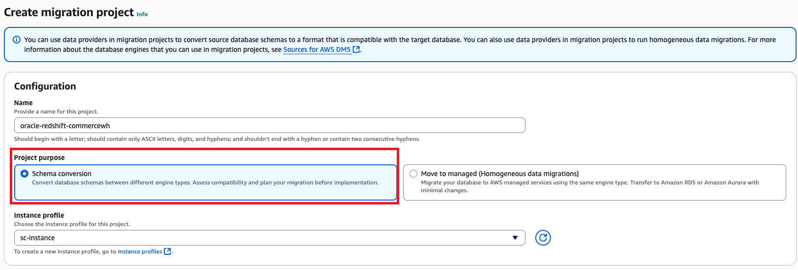 - For Name, enter a name to identify your migration project (for example, oracle-redshift-commercewh).