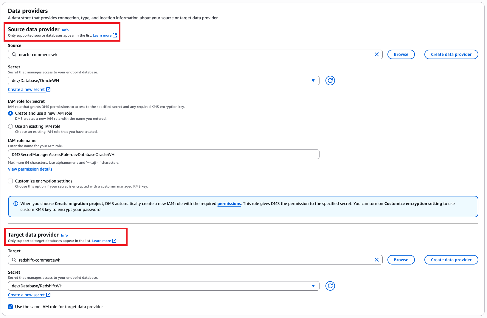 - In the Data providers section, enter the source and target data providers, Secrets Manager secret, and IAM roles.