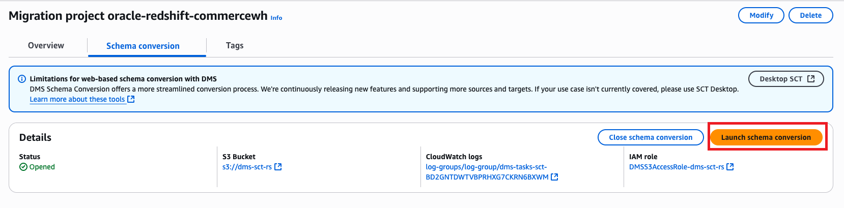 - On the Schema conversion tab, choose Launch schema conversion.
