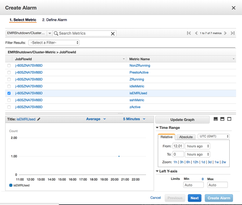 - Choose the isEMRUsed metric of the EMR JobFlowId, and then choose Next.