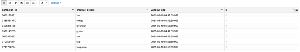 After you create the tables, run a query that calculates the number of impressions within a tumbling window of 60 seconds broken down by campaign_id and creative_details: