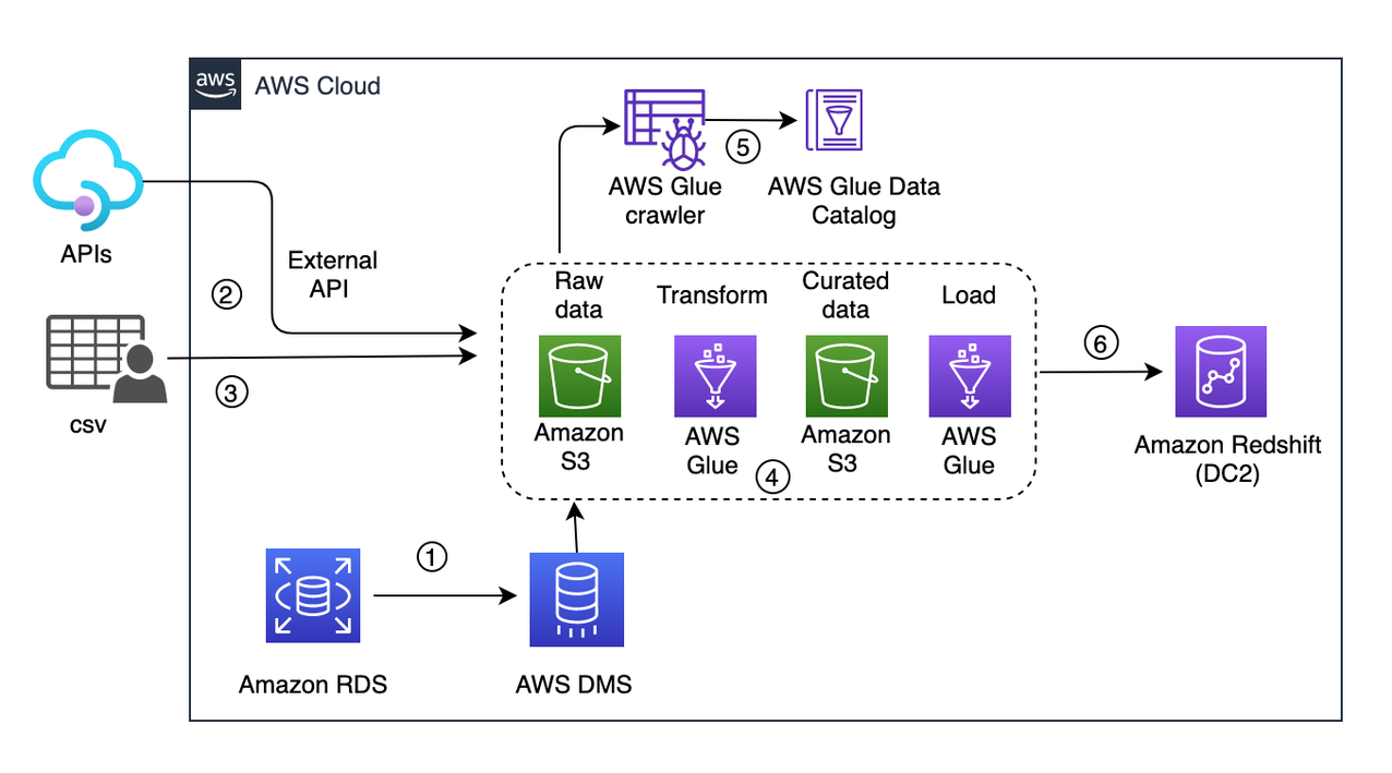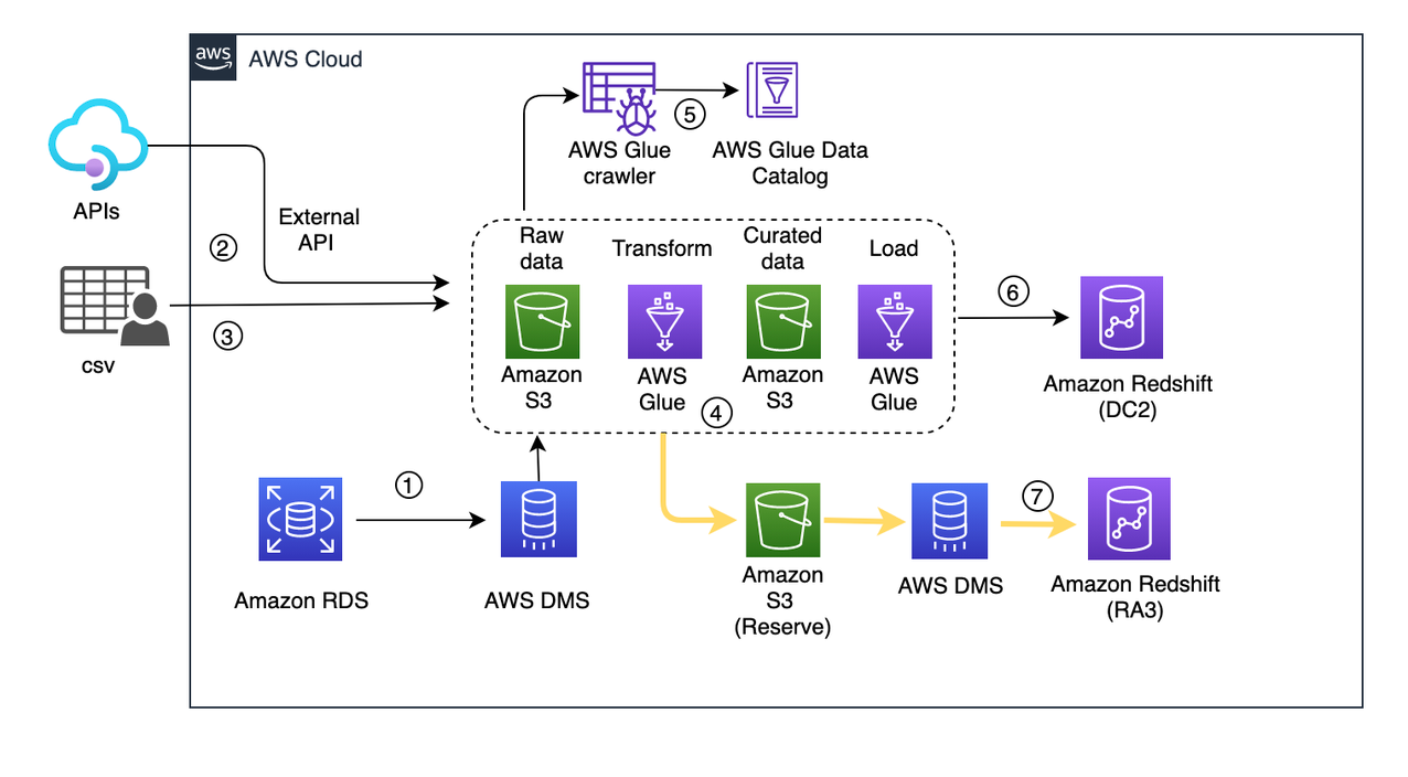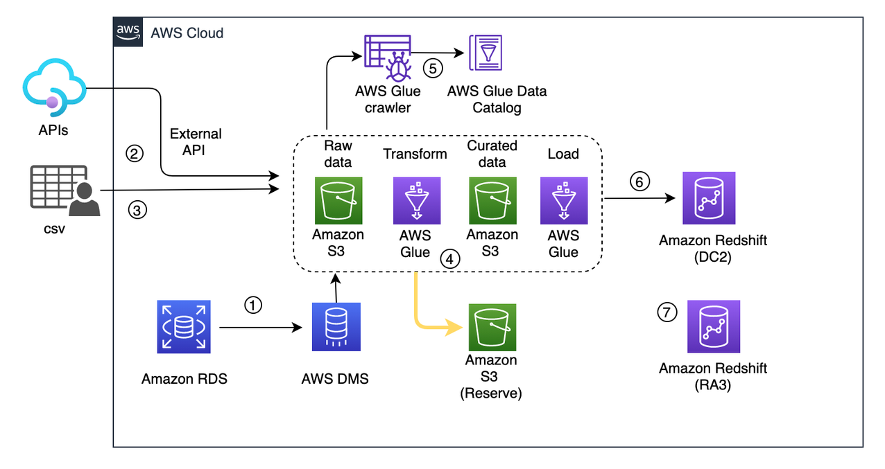 - Change data capture (CDC) from an RDS instance via AWS DMS (1 in the preceding diagram)