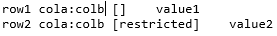 root@instance> insert row2 cola colb value2 -l restricted root@instance> scan