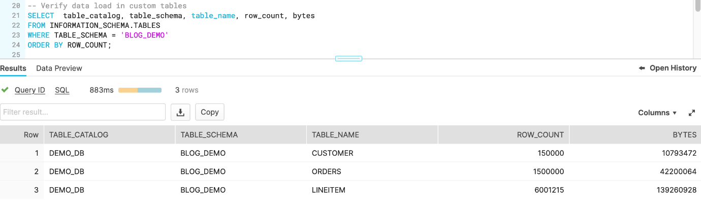 Customer,LineItem, andOrderstables in theTPCH_SF1schema to theBLOG_DEMOschema: - Verify that the tables have been duplicated successfully: