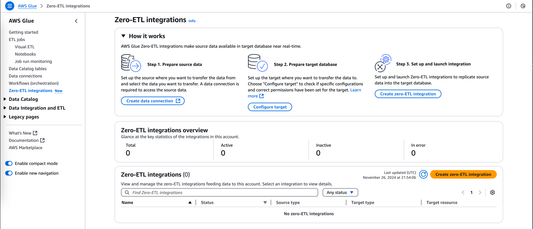 - In the navigation pane, under Data catalog, choose Zero-ETL integrations.