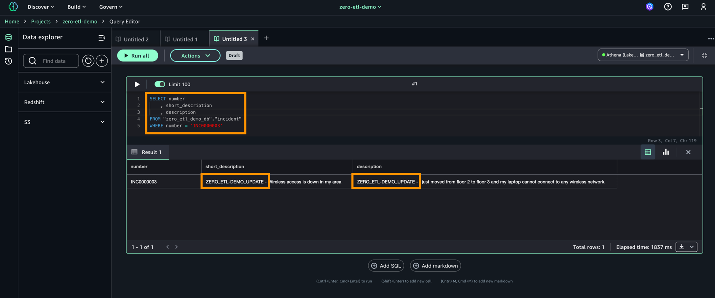 The CDC load is a technique used to identify and process only the data that has changed in a source system since the last extraction. Instead of reloading an entire dataset, CDC captures and transfers only the new, updated, or deleted records into the target system, making data processing more efficient and reducing load times. The status and statistics of the CDC load are published into CloudWatch. For this post, you will use Amazon SageMaker unified studio to query the data ingested. Use the following steps to access zero-ETL integration logs and query the data ingested. For the next step in this example, you will select an incident and perform an update in ServiceNow, changing the short_description and description of the incident.