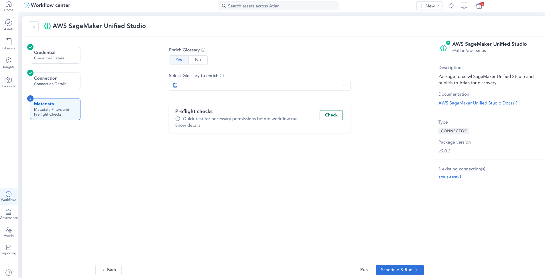 After the connection is established, the metadata sync workflow can be triggered either on a defined schedule or manually by the user, providing flexibility based on organizational needs. When triggered, the Atlan SageMaker Unified Studio app calls the SageMaker Unified Studio APIs to ingest assets and metadata from the source system.