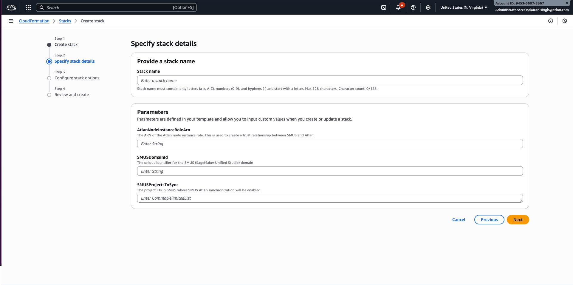 - SMUSProjectsToSync – The project IDs where SageMaker Unified Studio and Atlan synchronization will be enabled. You can choose to either add the project IDs and keep updating this stack every time a Project is added or add the created IAM role to each project as owner.