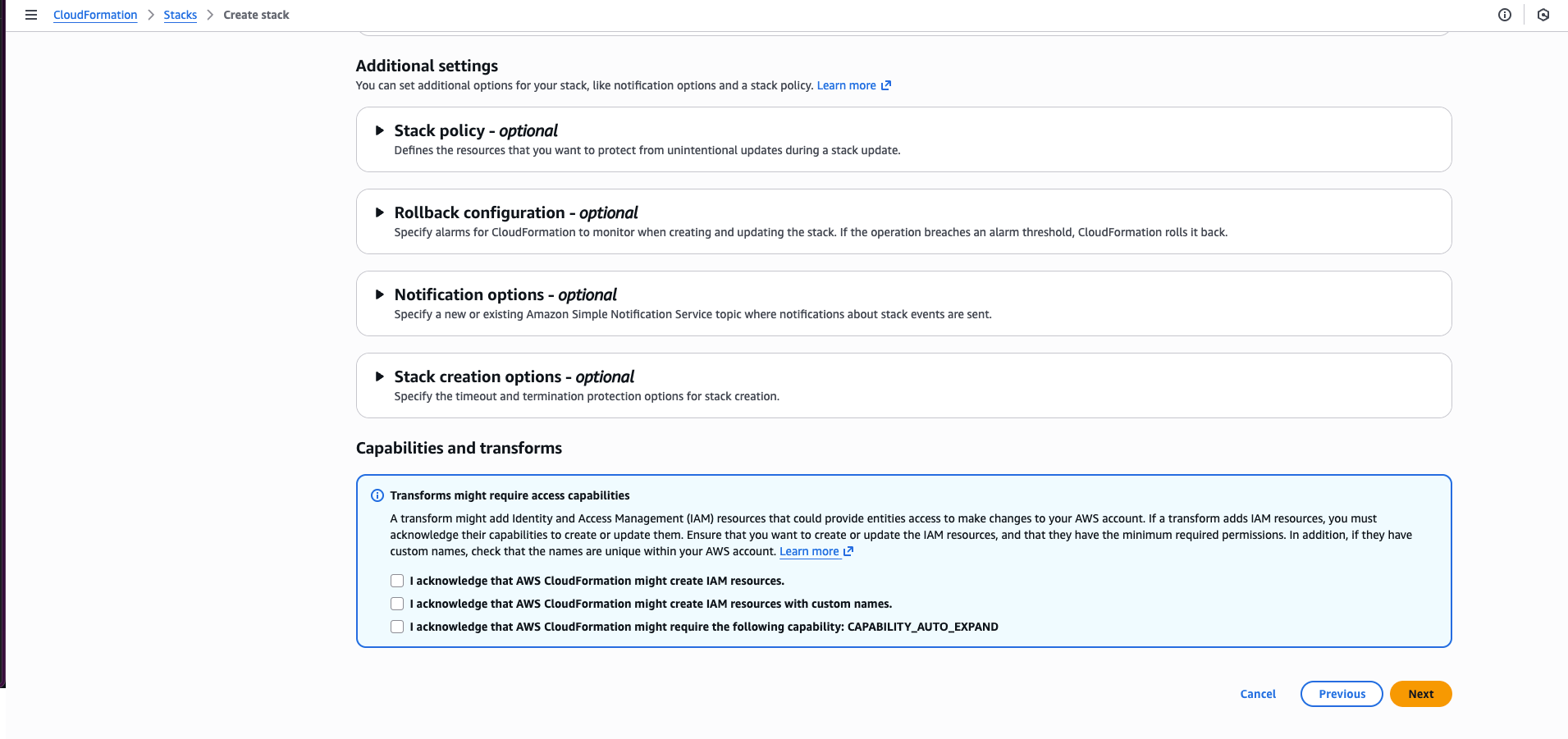 - Delete the CloudFormation stack. Navigate to the AWS CloudFormation console, locate the stack deployed for this solution, and choose Delete. This action removes the AWS resources provisioned by the stack, including IAM roles, policies, and supporting components.