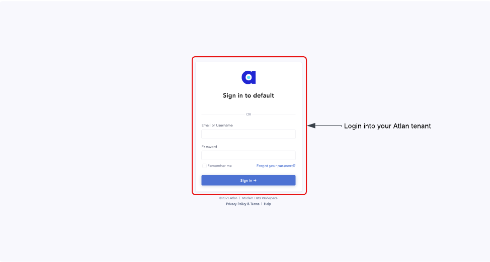 - Sign in to your Atlan tenant, as shown in the following screenshot.