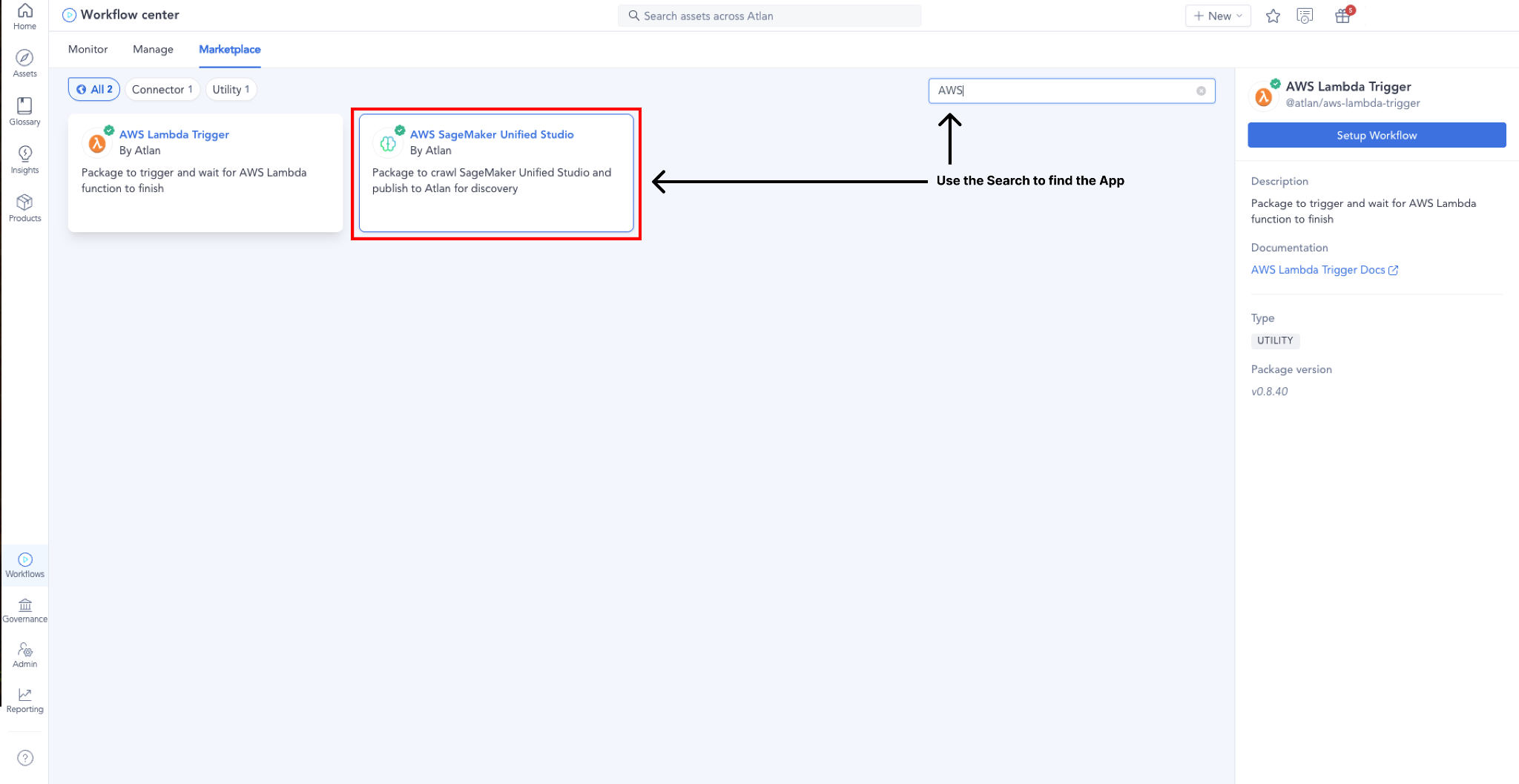 - On the Marketplace tab, search for and select the AWS SageMaker Unified Studio app, as shown in the following screenshot.